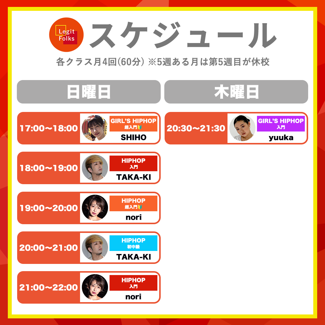 代講・休校になる場合がございます。公式SNSでお知らせしておりますのでご確認ください。 ※赤羽校 STYLE HIPHOP 入門クラス Yuina は2月からとなります。
